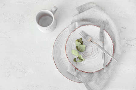 Vintage zero waste silverware. Rustic vintage set of white plate, wooden spoon and fork on napkin for dishes from water hyacinth on light gray concrete background. empty dishes. top view. Mock up.