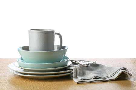 Set of white dishes and cups on light color wooden table. White ceramic dishware set on a wooden table