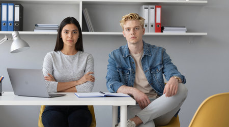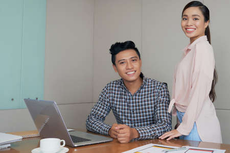 Portrait of two young designers working together in office. They are using laptop and smiling