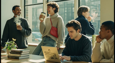 A group of young adults in a cozy cafe, enjoying coffee and working on laptops, with sunlight streaming through large windows