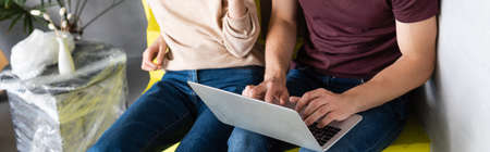 Young couple using laptop and drinking coffee at home. They are sitting on the windowsill.
