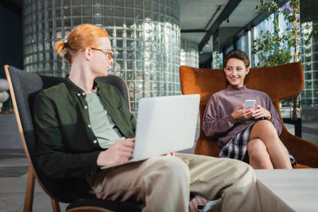 Smiling woman with cellphone looking at blurred boyfriend using laptop in hotel lobby