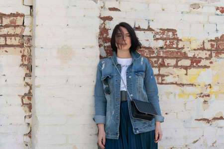 Pretty teenage girl in a shirt and jeans posing next to a stone wall