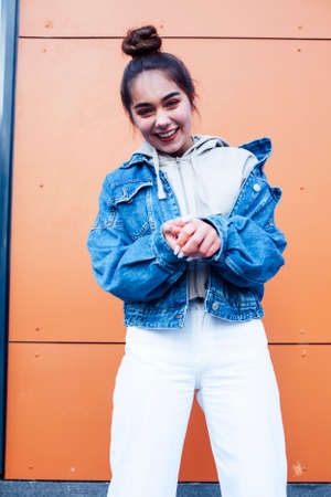 young pretty teenage girl posing cheerful happy smiling wearing street style outside in europe city, lifestyle people concept