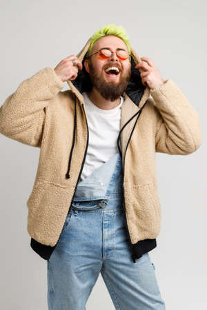 Extremely happy bearded young adult man wearing denim overalls and jacket, laughing out loud, keeping hands on his hood, hears funny joke. Indoor studio shot isolated over gray background.