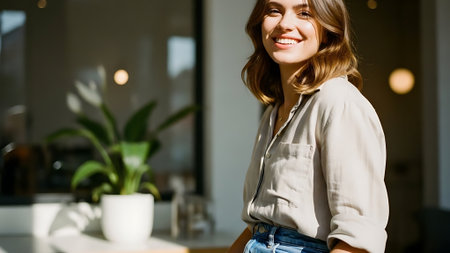 A smiling man with a well-groomed beard stands confidently in a stylish, minimalistic room, hands in pockets. The bright atmosphere, complemented by greenery, radiates positivity and approachability, making it perfect for professional or lifestyle themes.