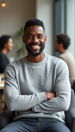 A cheerful Black man sits confidently with crossed arms, exuding warmth and positivity in a modern café. The soft, inviting atmosphere is enhanced by blurred figures of friends chatting in the background, creating a sense of community and connection.