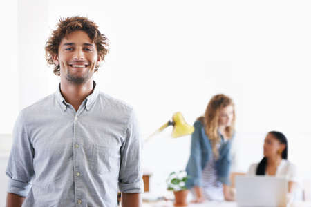 One of our creative professionals. Portrait of a young office professional with his colleagues in the background.
