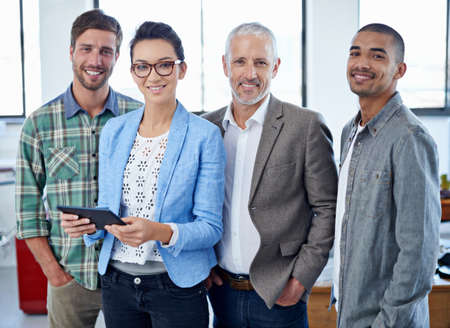 Shot of successful business multiage team posing and looking at camera in modern startup.