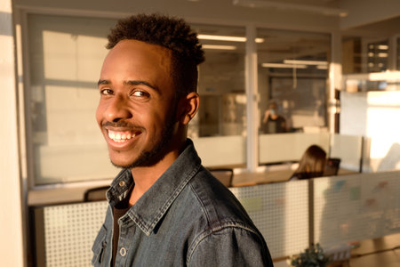 Portrait of young attractive African American man in denim shirt standing in office and smiling at camera cheerfully