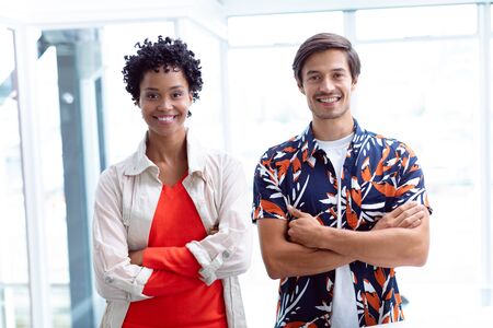 Front view of young diverse business people with arms crossed looking at camera in a modern office