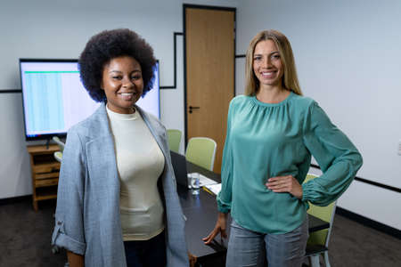Portrait of diverse female business colleagues in meeting room looking to camera and smiling. business person at work in modern office.