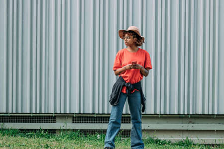 attractive happy young student holding mobile phone, communication concept and urban lifestyle, copy space for text
