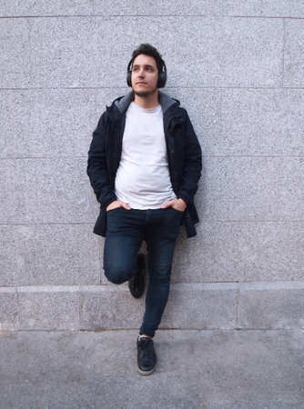 Latin handsome young man looking at upwards with his headphones on. Hand in his pocket. Gray wall background. Lifestyle.