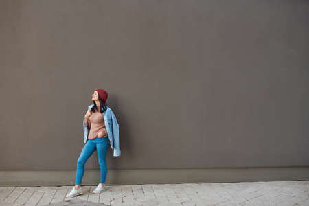 Charming slim lady in denim coat over her shoulders and knitted beanie on head standing on a street