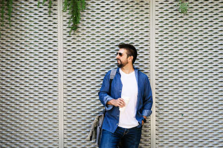 Portrait of a handsome man in blue t-shirt standing with coffee to go on a metallic wall background