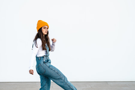 A young Caucasian female wearing denim pants, white shirt and a yellow hat posing against a white wall