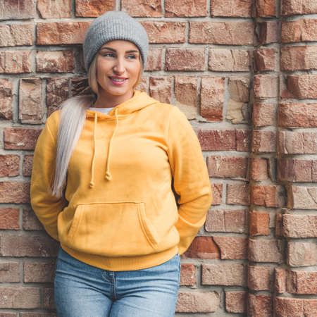 Close up of woman's hands of unrecognizable person in pockets of yellow hoodie on gray brick background. Front view on body part of young female in sweatshirt