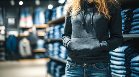 A shopper explores a variety of relaxed, everyday sweatshirts in a well-lit retail space, browsing through different colors and styles with a casual vibe.