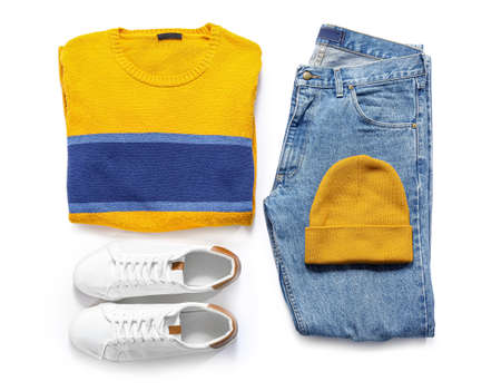 Stylish sweater, jeans, hat and shoes on white background