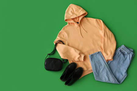 Peachy hoodie with bag, jeans and boots on green background