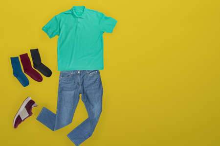 flat lay, men's fashion.blue jeans, red sneakers, green t-shirt, dofferemt colors socks on yellow background. casual clothes top view