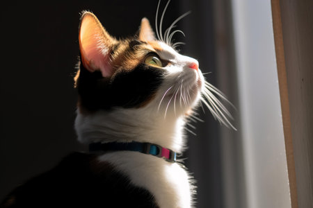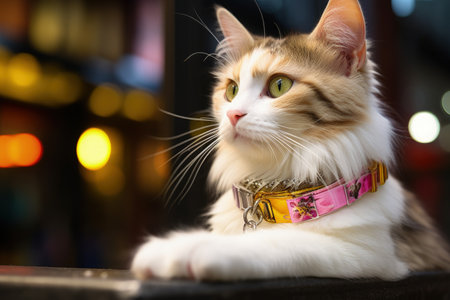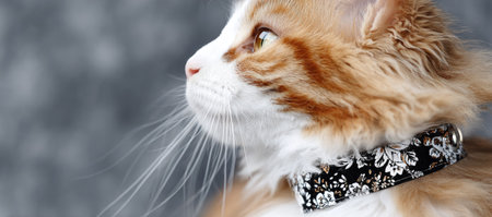 A side-profile image presents a domestic feline. The cat exhibits a mix of orange and white fur and wears a patterned collar. The composition uses shallow depth of field, emphasizing the cat's features. This style could be used for animal-related content, advertising, or editorial publications.