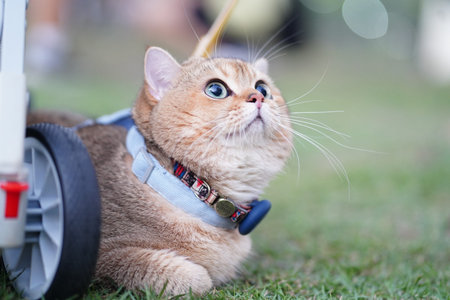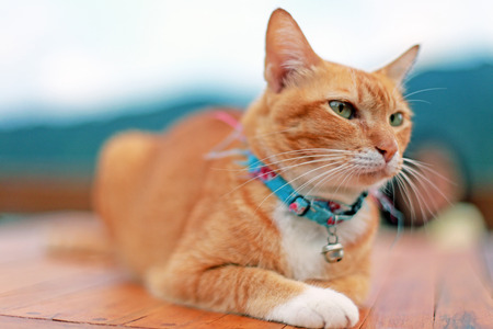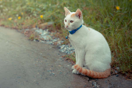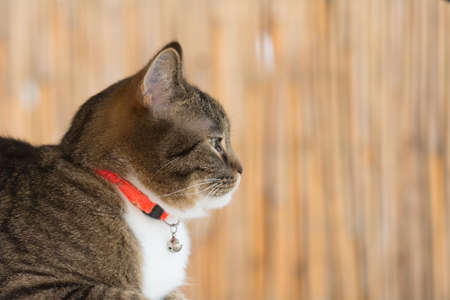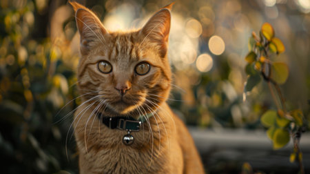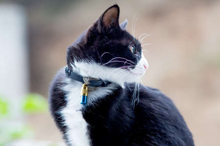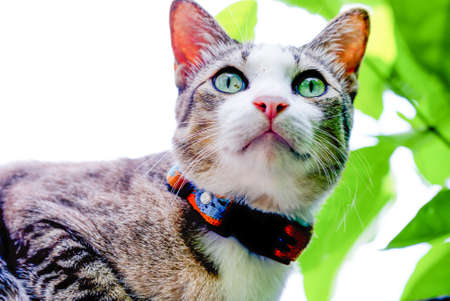 Portrait of a cat with colorful collar in the garden. selective focus.