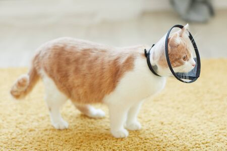 Domestic cat in collar from fleas walking along the carpet in the room