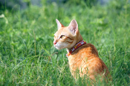 Cute ginger cat sitting on the grass and looking at the camera