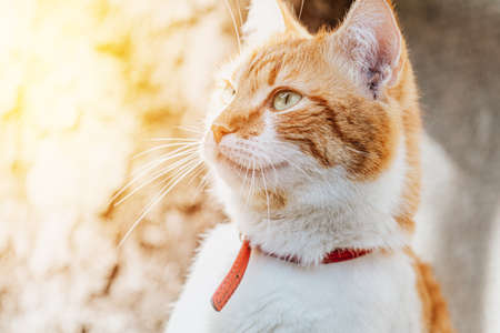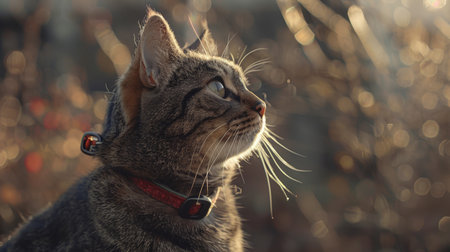 Cute tabby cat with a collar in the rays of the setting sun