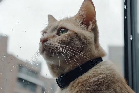 A curious cat gazes out a window during a rainy day, capturing a moment of tranquility. The soft fur and striking green eyes add charm to this peaceful indoor scene.