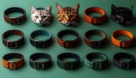 A curated collection of stylish cat collars is neatly arranged, showcasing a wide variety of colors and materials. Among them, the faces of different cat breedsa Bengal, a silver tabby, and a black catpeek out, as if waiting to be matched with the perfect accessory that reflects their unique personality. This overhead view on a green background highlights the concept of choice and personalization in pet care.