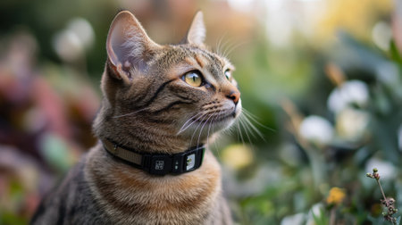 Alert Tabby Cat Wearing a wi-fi Collar Sitting Outdoors in a Garden with Flowers.