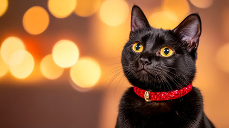 Black cat with red collar posing on a sparkling background