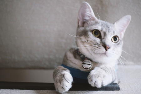 A cute domestic cat looking up with a blurred background