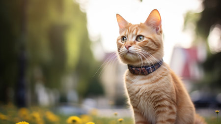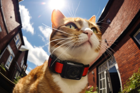 Cat walking outdoors wearing small streaming camera on it's collar. Pet wearing gps tracking device. Generative AI.