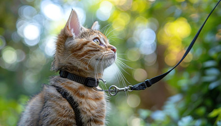This charming image features a fluffy cat on grass, wearing a collar and leash, showcasing its adorable gaze and playful demeanor in a serene outdoor setting.