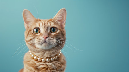 Elegant cat wearing pearl necklace on blue background.