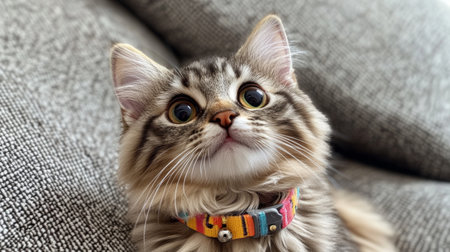 A cute fluffy cat with big round eyes wearing a colorful collar with a tiny bell, sitting comfortably on a couch, looking up curiously.
