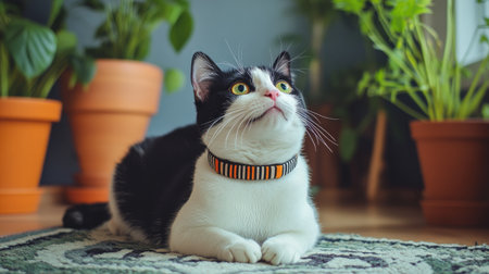 Black-and-white cat wearing a stylish striped collar, lying on a rug, looking up with wide eyes, cozy indoor setting