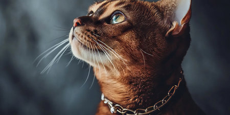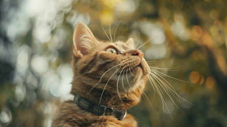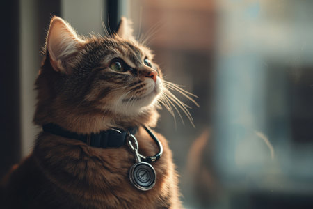 A close-up portrait showcases a domestic cat, adorned with a decorative collar. Its fur displays a blend of brown, tan, and black tones. The image is composed with soft lighting and a blurred backdrop, emphasizing the subject's details. Suitable for various applications, including pet-related content and design projects.