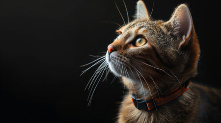 Portrait of a cat with orange collar on a black background.