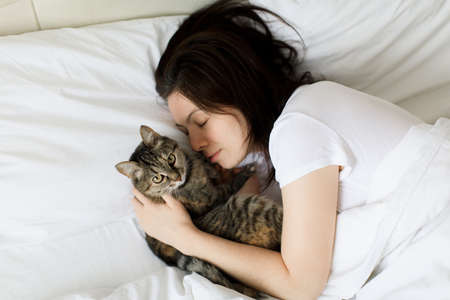 beautiful smiling girl with eyes closed lying in bed and hugging cat
