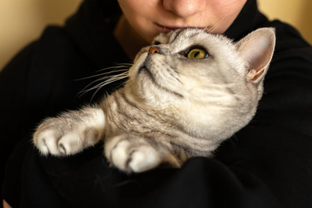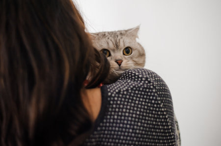 woman holding cute Scottish cat with yellow eyes. Female hugging her cute hair kitty. Adorable domestic pet concept.