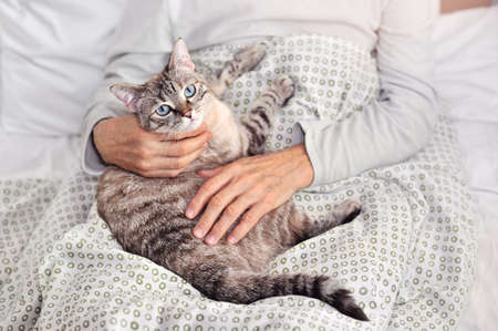A gray striped cat with green eyes is sitting in the girls arms. Womens hands are stroking a pet. They are sitting on the bed in the bedroom. International Cat Day