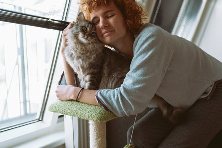 portrait young woman hugging gray fluffy domestic cat