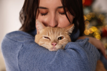 Woman with cute ginger cat in room decorated for Christmas, closeup