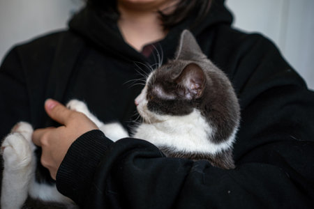 A woman is holding a kitten in her arms. The kitten is gray and white. The woman is wearing a black hoodie.