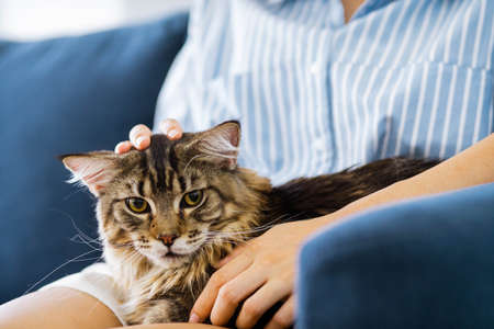 Woman relaxing on the sofa at home and cuddling her beautiful long hair Maine Coon cat